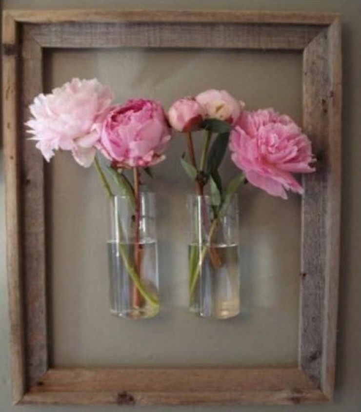 9. Des verres à shot fixés à un cadre en bois pour suspendre quelques fleurs fraîchement ramassées